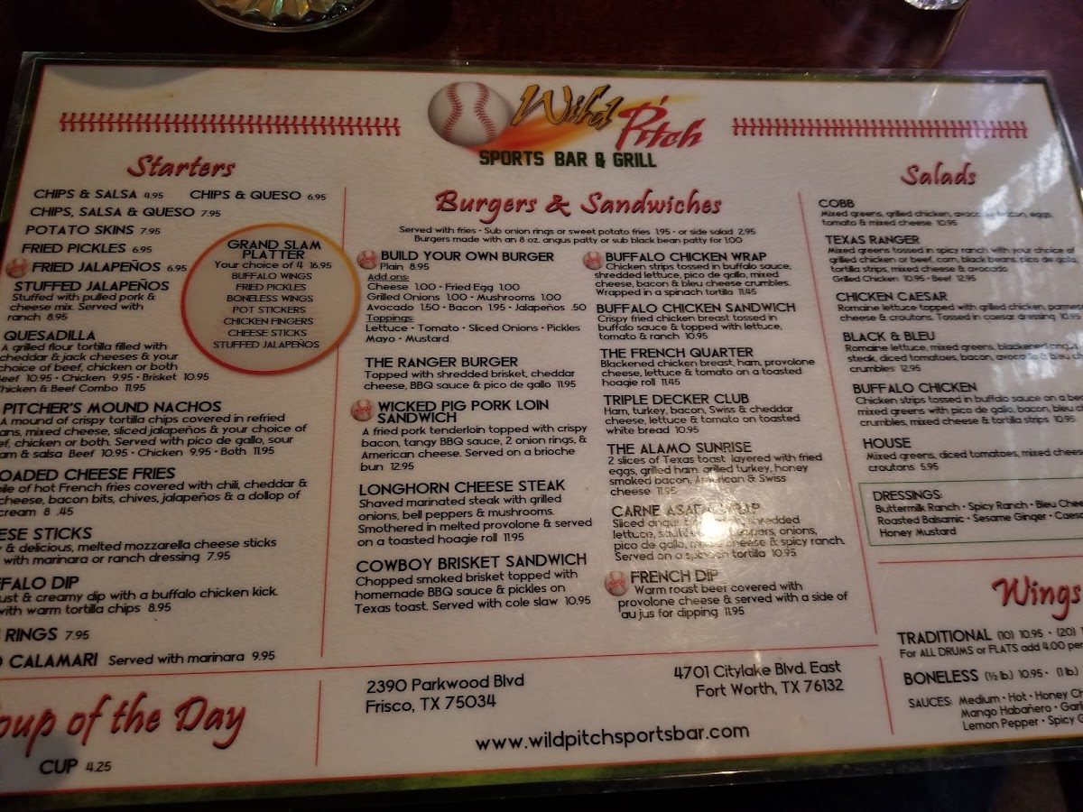 Welcome to Wild Pitch Sports Bar & Grill, a vibrant spot in Fort Worth, TX, where culinary creativity meets a sports-centered atmosphere. The menu boasts an array of offerings designed to satisfy any palate. Start with refreshing Spring Training Salads like the hearty Steak Salad or the classic Cobb Salad, packed with delectable toppings. Craving something unique? Build your own pizza or dive into the Ryan Express, featuring a delightful blend of flavors with blackened spices.